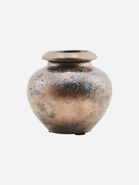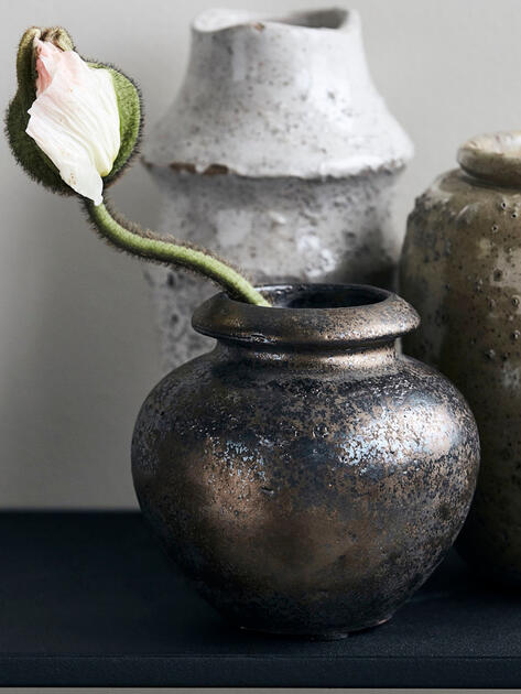 Malá vázička s dokonalou glazurou, která je kombinací tmavé barvy a třpytivého broznu.