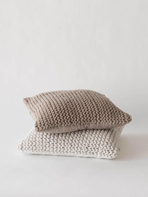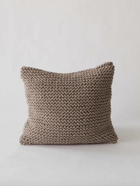 Povlak na polštář v barvě kaštanu s přední částí z pleteného lana a zadní stranou z hladké měkké bavlny. Polštář se zapíná na skrytý zip vzadu. Lze prát na 30 stupňů a nedoporučujeme jej sušit v sušičce na prádlo.