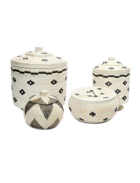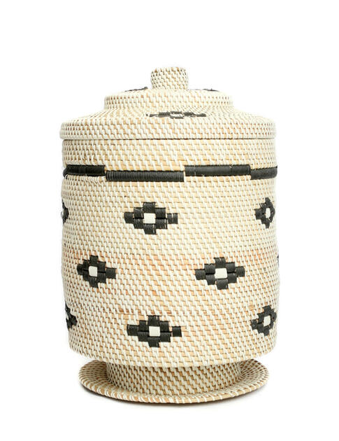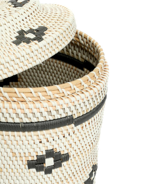 Krásný ručně vyráběný pletený koš z ratanu s něžným detailem rýžových květů ve stylu boho. Jednoduché černobílé provedení ladí s minimalistickým interiérem i boho oázou. Originální způsob, jak odložit maličkosti, které chcete mít při ruce.