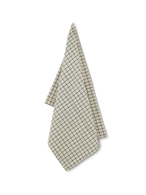 Bavlněná béžová utěrka sčerným kárem o rozměru 50 x 70 cm.