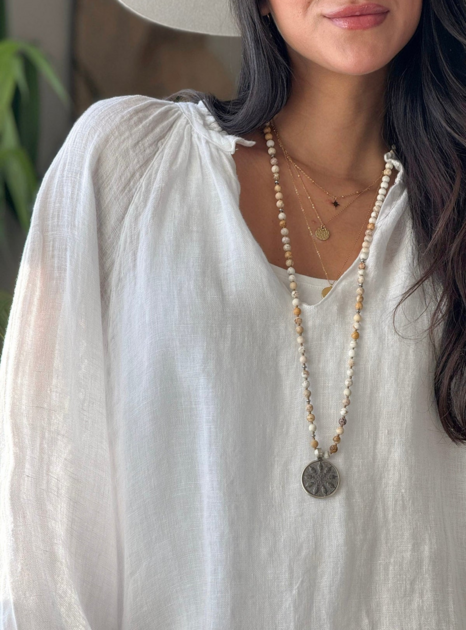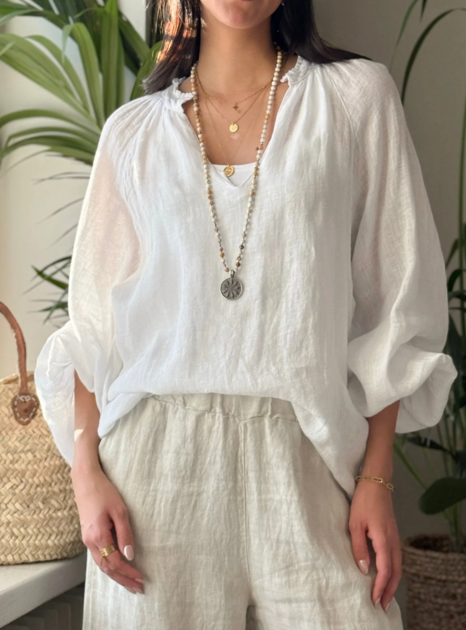 Krásně vzdušná halenka z gázového lnu s hlubokým výstřihem do V a výrazným volánkovým límcem. Široké, nafoukané rukávy umožňují volnost pohybu, zatímco elastické manžety dodávají extra pohodlí. Na lemu je zdobena jemným potiskem Bohemiana Family. Vyrobeno z lehké lněné gázy.