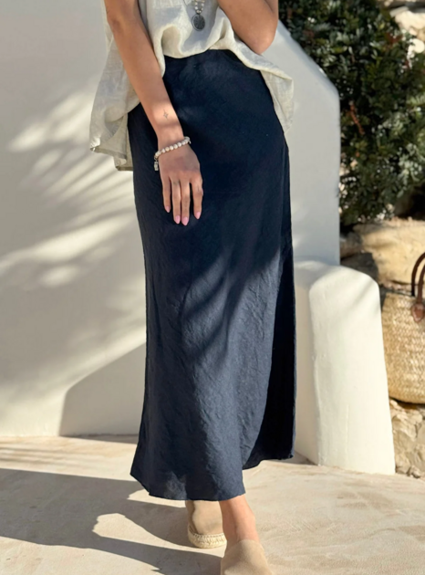 Dlouhá lněná sukně je krásně jednoduchá a vhodná ke každodennímu nošení. Úzký model áčkového střihu se snadno kombinuje s různými košilemi a úplety. V pase je pružná guma.