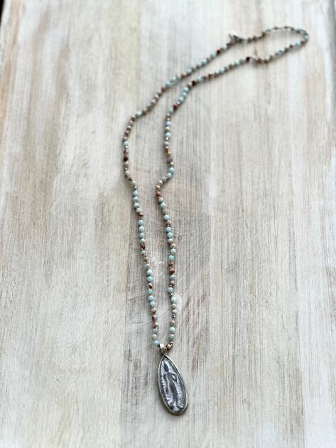 Náhrdelník z kamene Jaspis Imperial s ikonou Buddhy se stříbrným lemováním, který se dokonale doplňuje s produkty značky Bypias.
