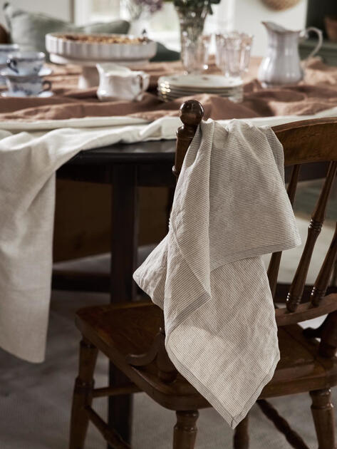 Béžová utěrka s jemným proužkem o rozměru 45 x 60 cm ze směsi bavlny a lnu.