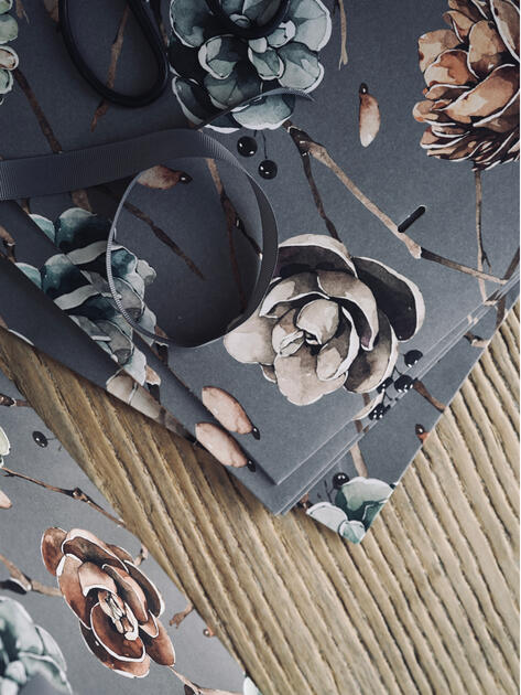 Dárková taška v tmavě šedé barvě z luxusního papíru s vysokou gramáží. Tašku zdobí krásný potisk s magnólií. Stuha není součástí balení.
