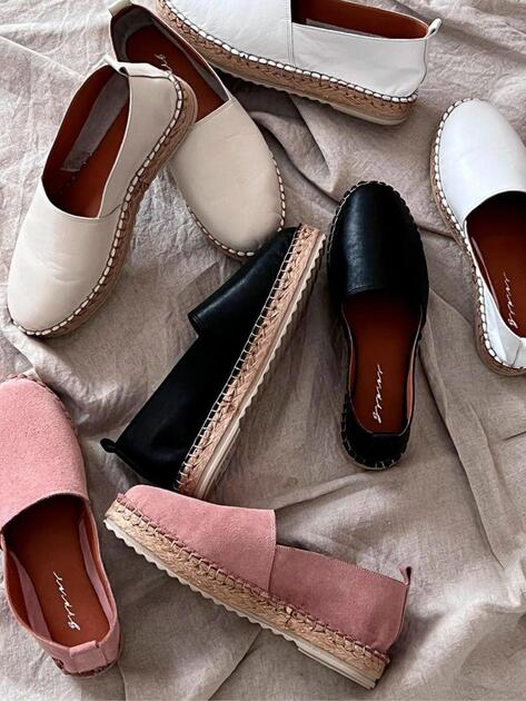 Klasické béžové espadrilky z měkké kůže se silnou gumovou podrážkou s jutovým opletem na povrchu. Na noze krásně sedí.