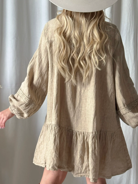 Okouzlující lněná tunika s krásnými krajkovými aplikacemi pro romantiký nádech. Kulatý výstřih se zapínáním na knoflíky na předním díle. Rukávy po celé délce s lehkým nabíráním a elastickým řasením na manžetách.