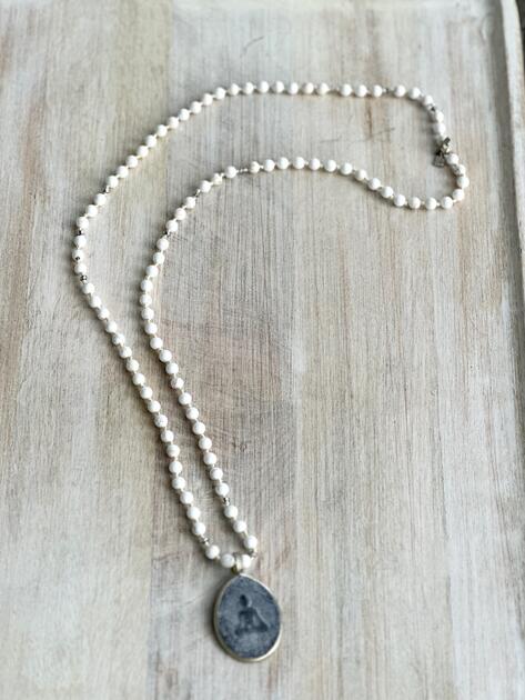 Náhrdelník z kamene Howlite s ikonou Buddhy se stříbrným lemováním, který se dokonale doplňuje s produkty značky Bypias.