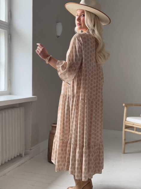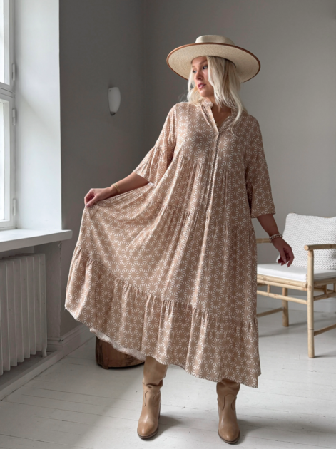 Viskózové šaty v midi délce s krásnými vzory. Výstřih do V a knoflíky v horní části šatů. Průřez pod prsy. Střih do A a rozšířené manžety. Pásek na fotce není součástí šatů.