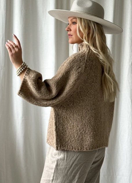 Měkký pletený svetr Moya se stojáčkem a lehkým žebrováním na manžetách a lemu. Svetr má volné , mírně zkrácené rukávy a široký lem. Svetry z materiálu Bouckle se snadno udržují a nesvědí.