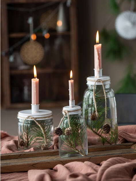 Originální skleněný svícen s kovovým víkem v bílé barvě. Do svícnu můžete dát dekorace dle Vašich představ a svíčku dáte do kovového víka.