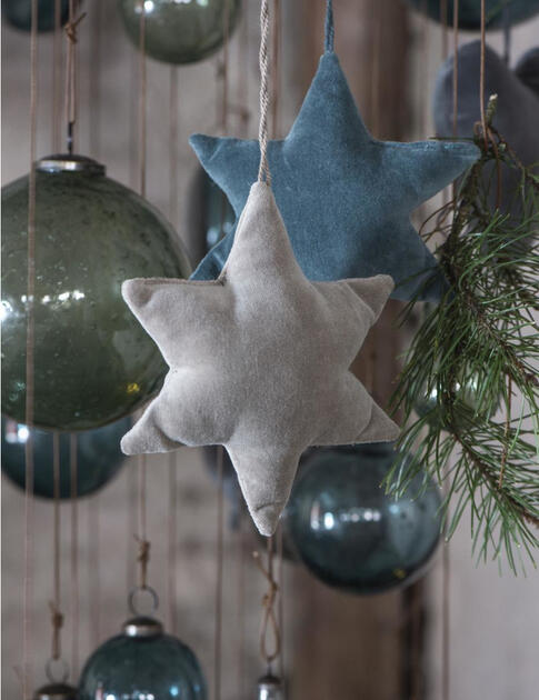 Šedá velurová hvězda jako krásná vánoční dekorace, kterou můžete pověsit na větvičky nebo stroměček.