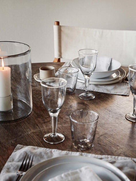 Ručně vyráběné sklenice na vodu z recyklovaného skla v čiré barvě. Vhodné do myčky na nádobí.