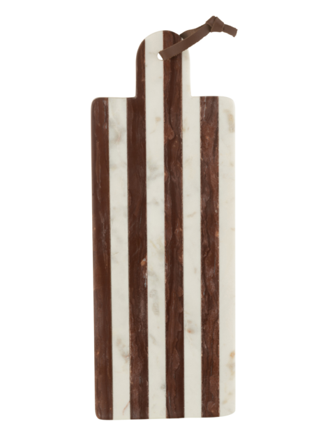 Velké obdélníkové prkénko z bílého a hnědého mramoru s pruhovaným designem. Stylové a praktické pro servírování i přípravu pokrmů, dodá vaší kuchyni moderní vzhled.